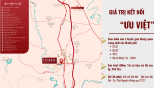 Không chỉ thừa hưởng lợi thế ngay cửa ngõ phía Nam Thái Nguyên, tiếp giáp với Hà Nội, Central Square Phổ Yên – Thái Nguyên dễ dàng kết nối tới Vành đai 5 với thiết kế 6 làn đường, lòng đường rộng 35m, kết nối 36 quận, huyện, thành phố trực thuộc 8 tỉnh (Hà Nội, Hòa Bình, Hà Nam, Thái Bình, Hải Dương, Bắc Giang, Vĩnh Phúc và Thái Nguyên).